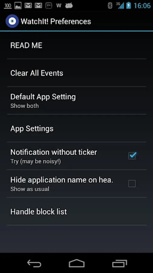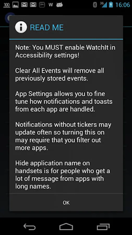 NOTE: You MUST turn on Accessibility for this app to work at all. For 4.3+ you may *instead* use Notification access - this avoids the Samsung firmware bugs (see below), but will not pick up Toasts. Your choice!