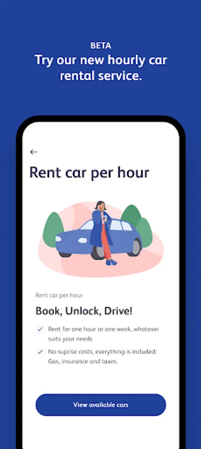 • Rent a car by the hour - Booking, Paying, unlocking and locking the car, all from the app.