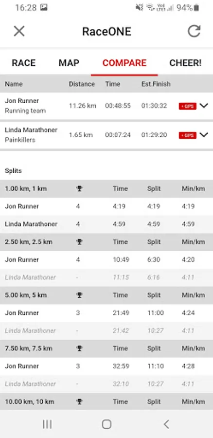 With RaceONE you can compare all the participants you follow in the compare view. See expected finish time, intermediate times, speed and distance.