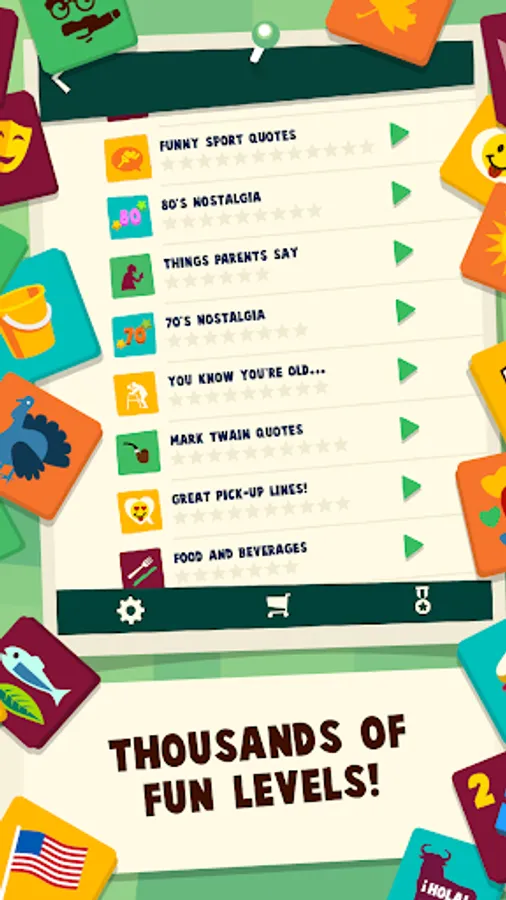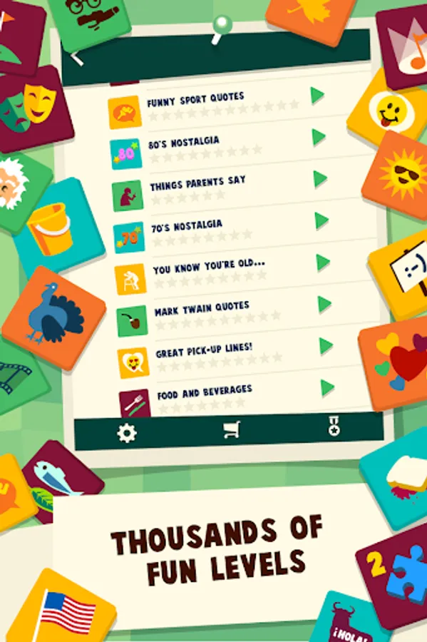 WordCollapse includes over 200 free puzzles. If you like the game there are more than 50 puzzle packs available in the shop. Choose between "60s Nostalgia”, “Funny puns”, “Song quotes” and much, much more!