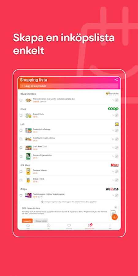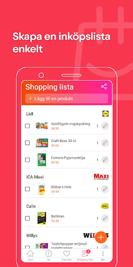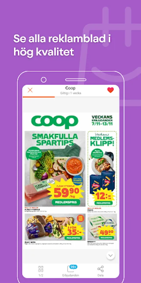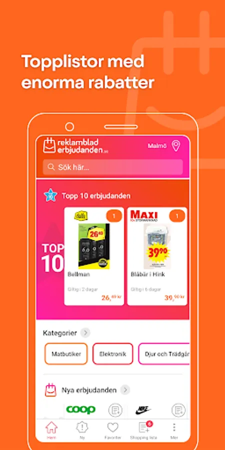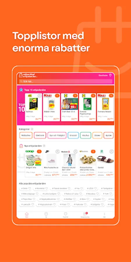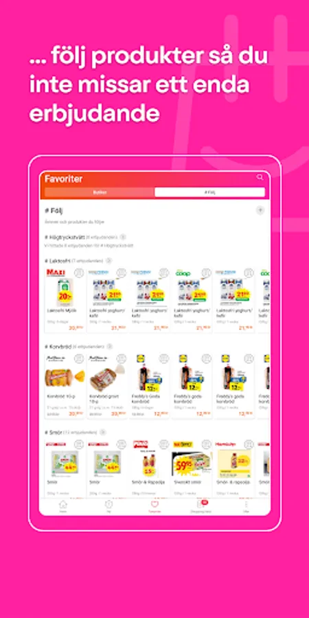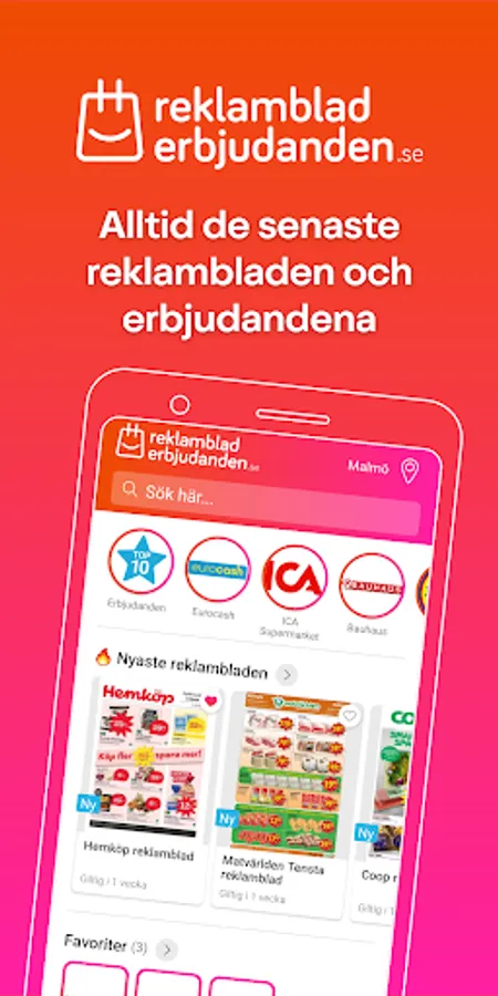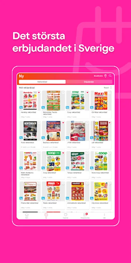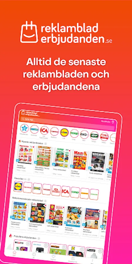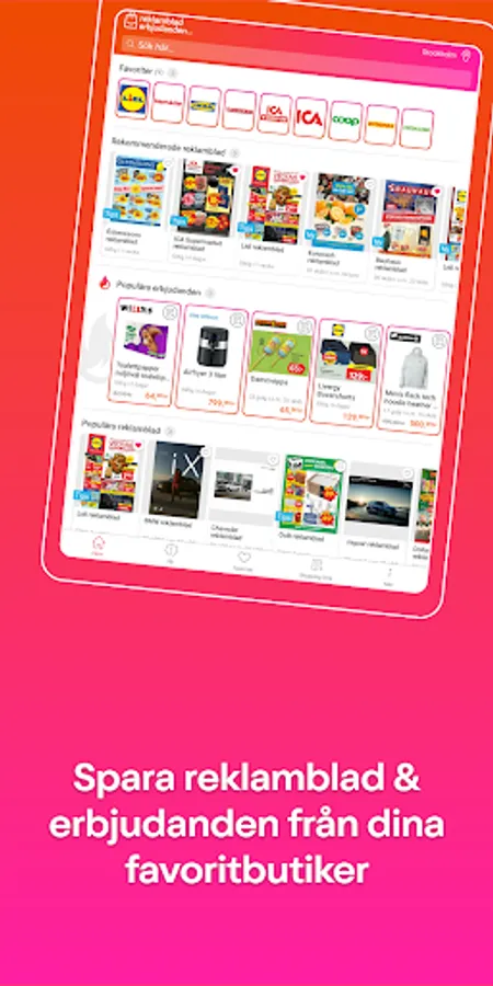 In our Reklambladerilbudanden.se app you can see all current flyers from both large and small store chains in Sweden, and not only grocery stores or hardware stores, but also electronics stores, clothing stores, toy stores, computer stores, pharmacies and many more. We have even included most local stores. If you want to choose a store as your favorite, you can click on the heart and in this way you will always be the first to find out when the particular store you are interested in has promotions. In this way, you create a smart collection of your favorites when it comes to flyers.