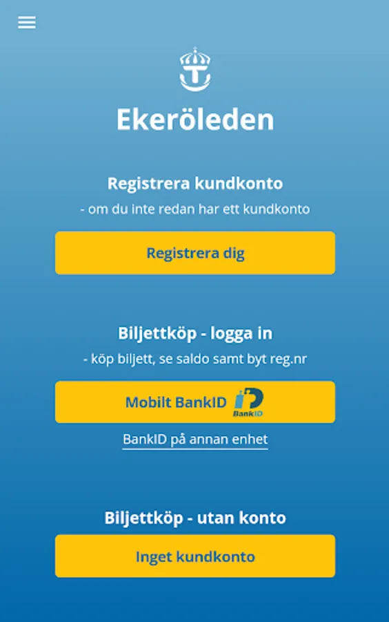 In the app "Åk Ekeröleden" you can easily buy and manage tickets and see the timetable for the ferry route Ekeröleden which runs between Slagsta / Fittja and Jungfrusund on Ekerö.