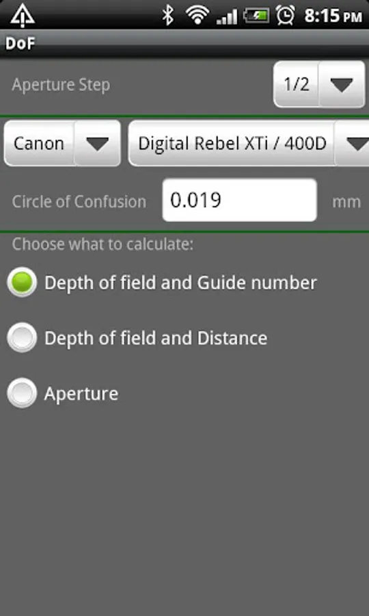 You can select whether the aperture values should be selected, and displayed, in full, half or thirds step. All your selections will be remembered even when you close the app.