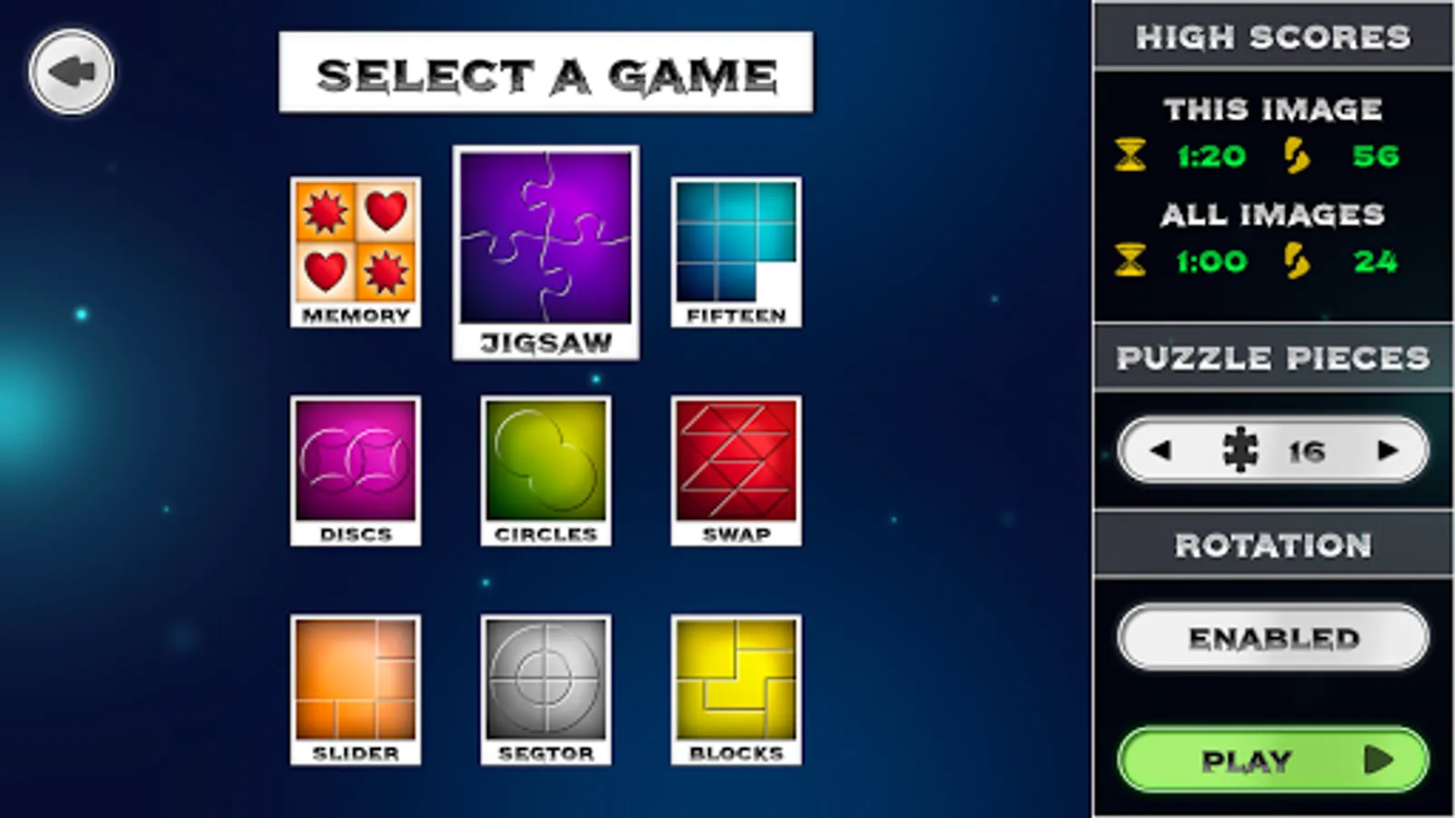 You will love the classic games like Jigsaw Puzzle, Memory, and Fifteen/Eight Puzzle, as well as the original games like "Circles", "Swap", "Slider", "Discs", "Blocks", and "Segtor".