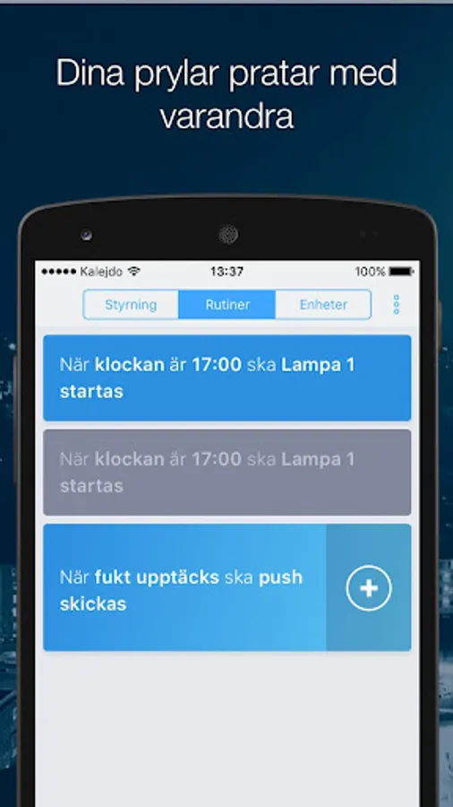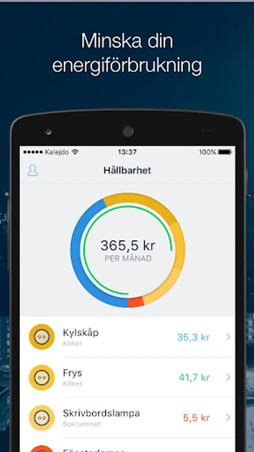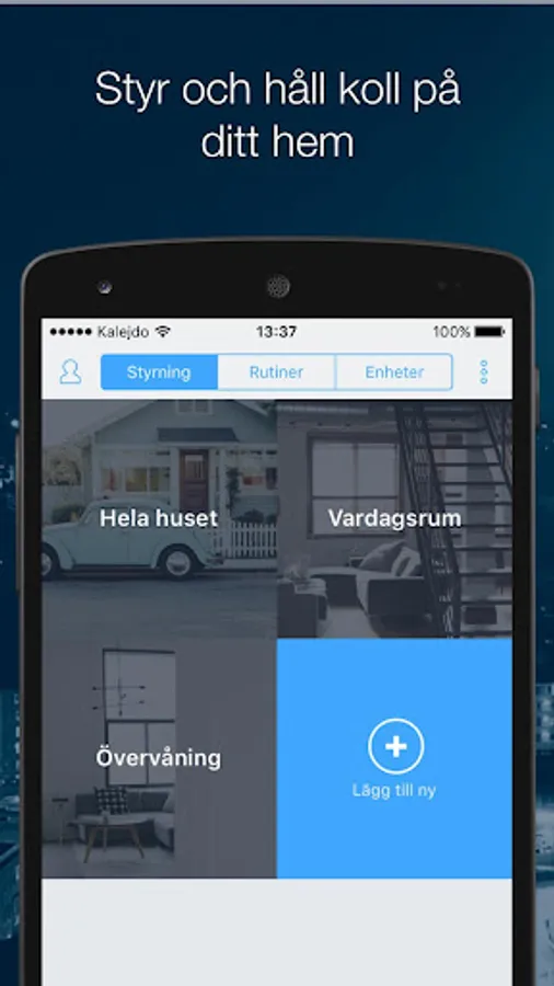 Connect your home to your city network! With the Kalejdo Home app, you can easily alarm your house, control equipment in the house, e.g. lights and coffee machine and get an overview of your energy consumption.