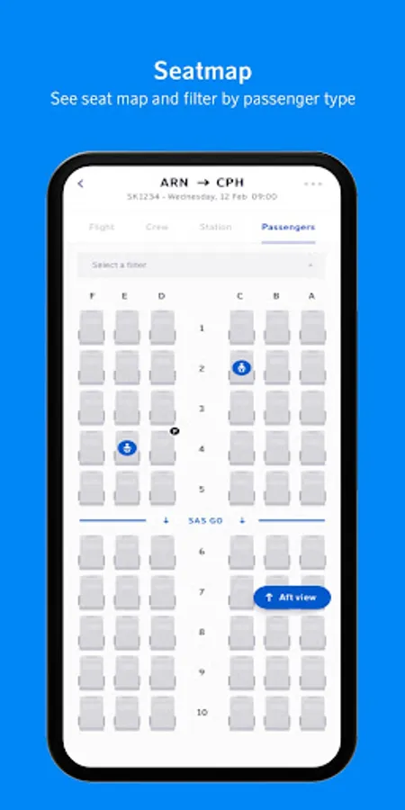 Access seat map and filter by passenger type, service class, connecting flights, etc.
