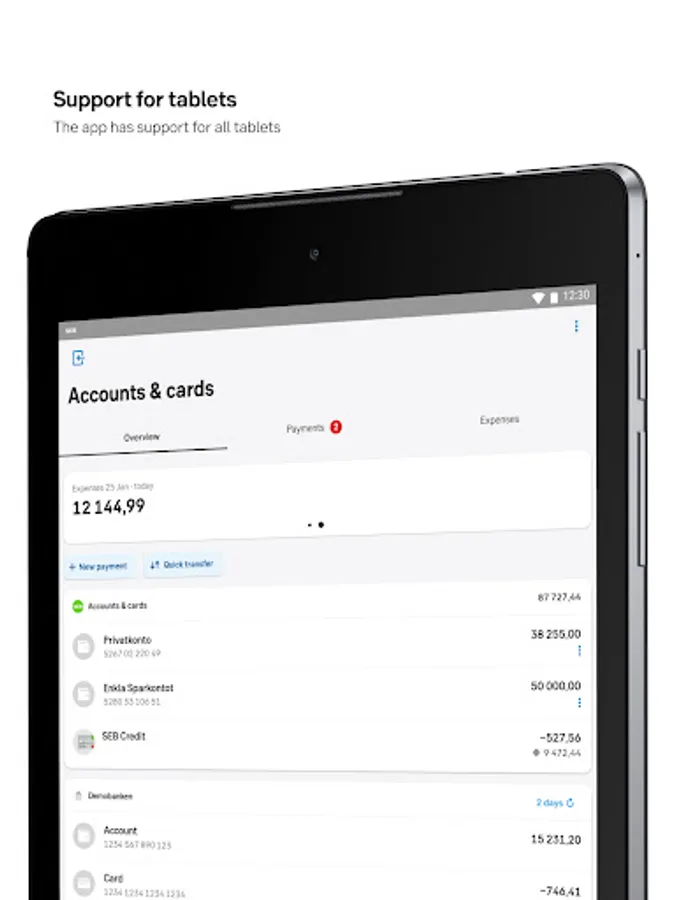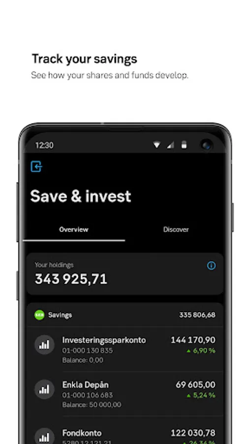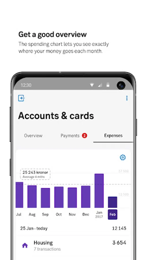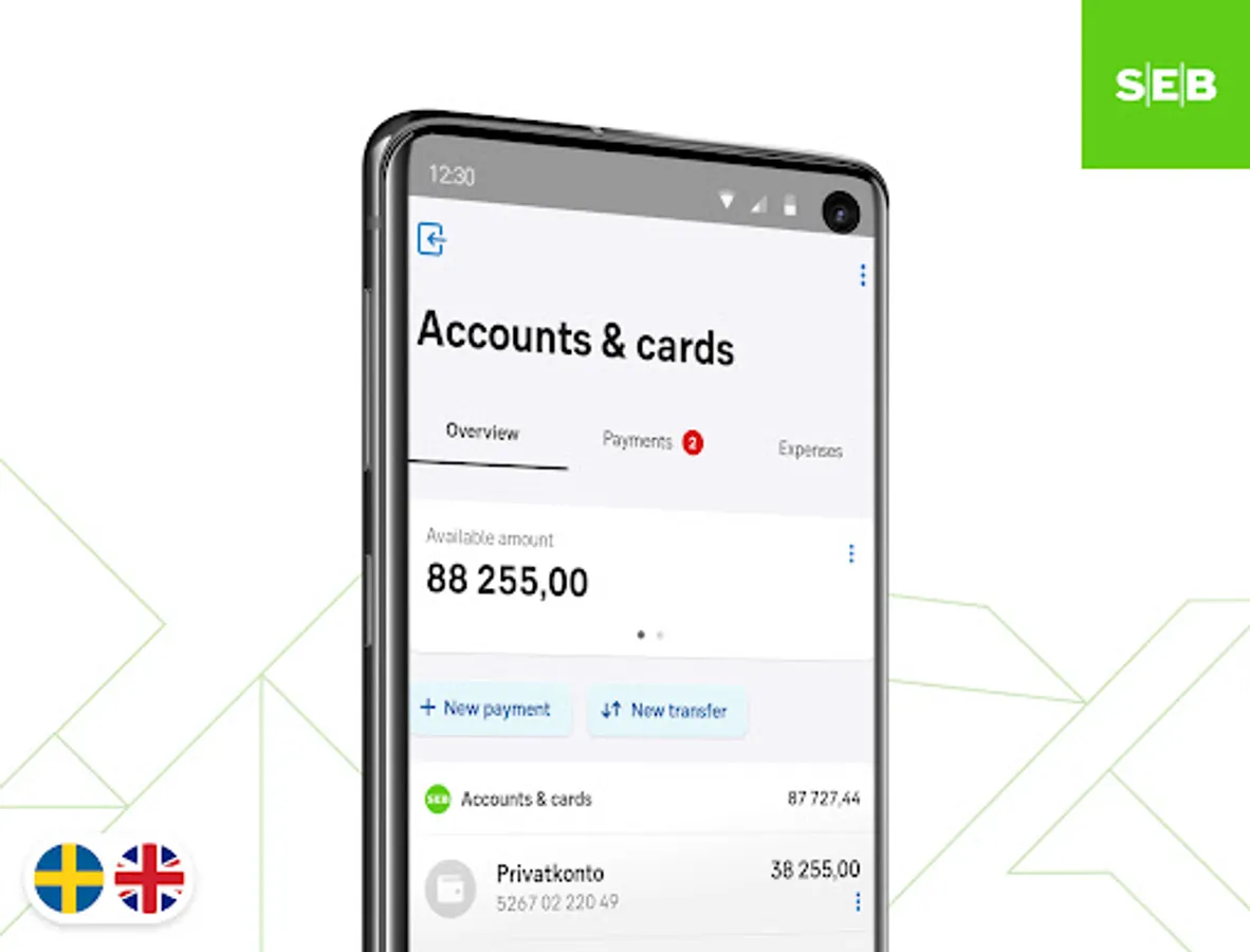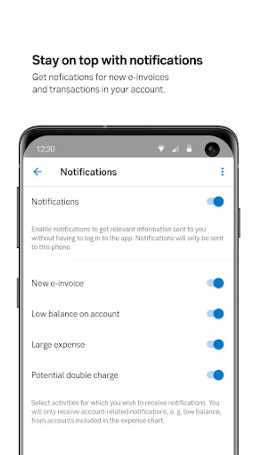 The app is designed for our private customers. Using the app, you’ll always be in control of your finances and can quickly transfer money, pay invoices and see upcoming transactions. You’ll receive notifications of new e-invoices and can easily scan paper invoices with your mobile camera. Your purchases are automatically categorised, so you can always check where your money is being spent.