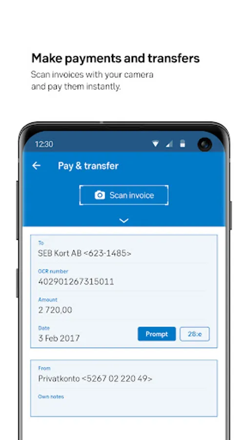 • Pay invoices by scanning the OCR number, amount and recipient with the mobile camera