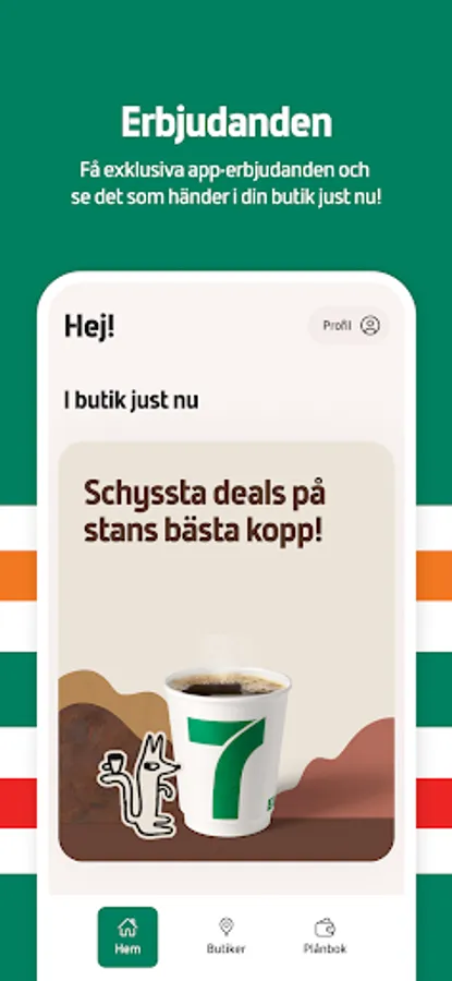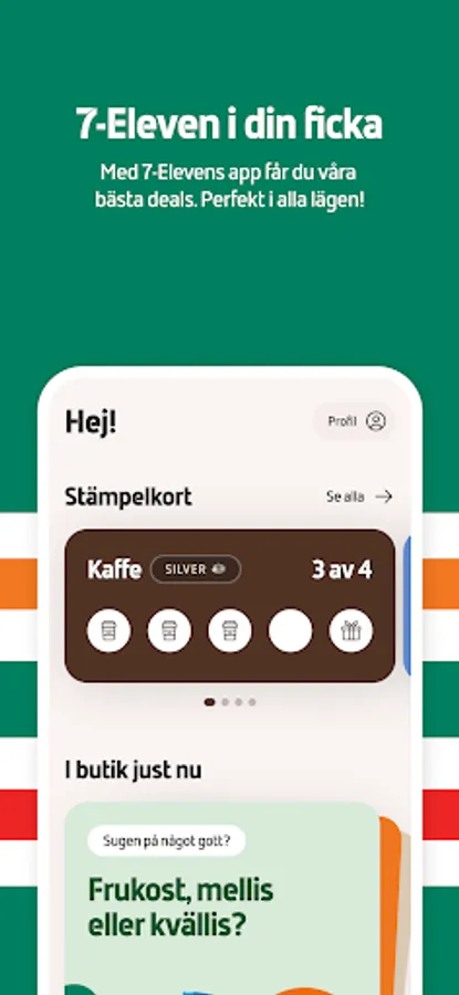 Say hello to 7-Eleven's new app! Here you get great deals on food, coffee, mellis and fika. Use our stamp cards and get, for example, up to every 4th coffee with the purchase as a gold member. 7-Eleven is always close to you and our app guides you to the nearest store. Welcome in!