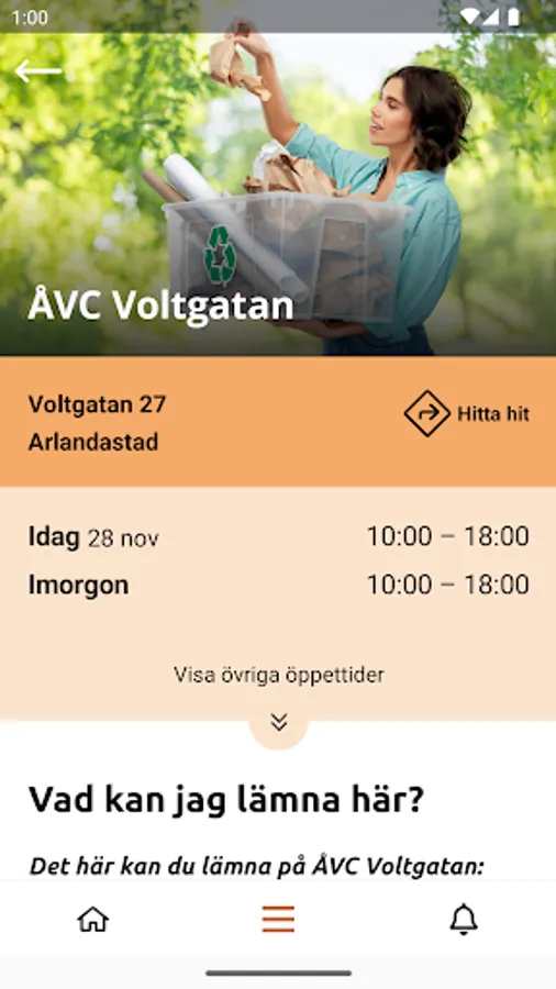 • Information about the recycling center's opening hours and contact information.