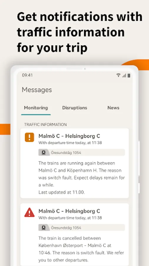 - Receive information about ongoing disruptions affecting traffic, or journeys you have chosen to monitor.