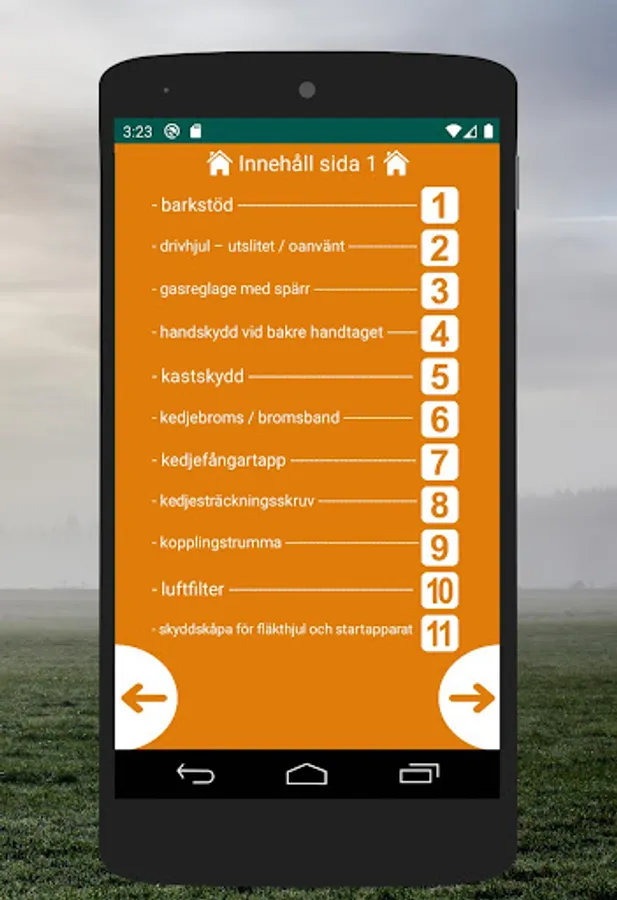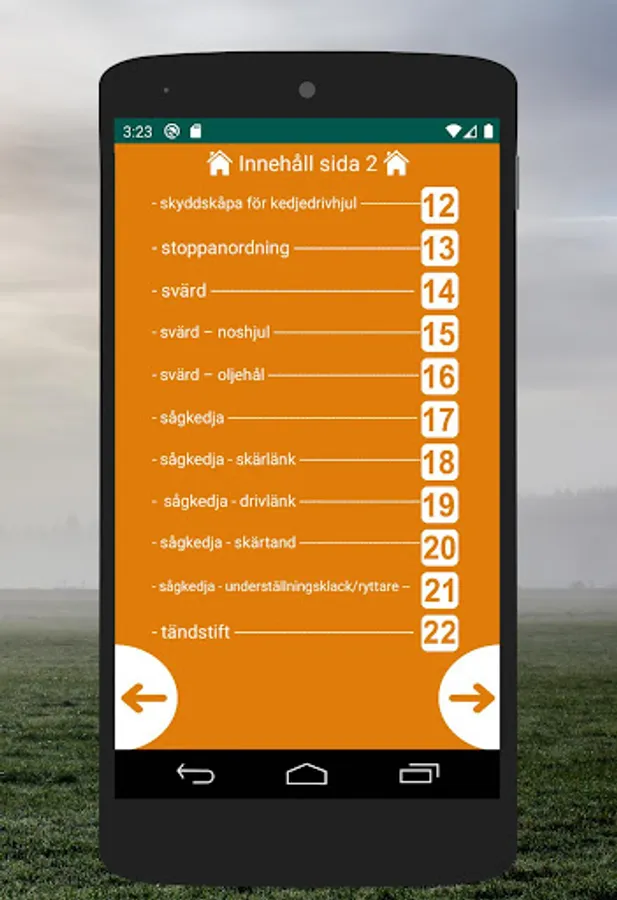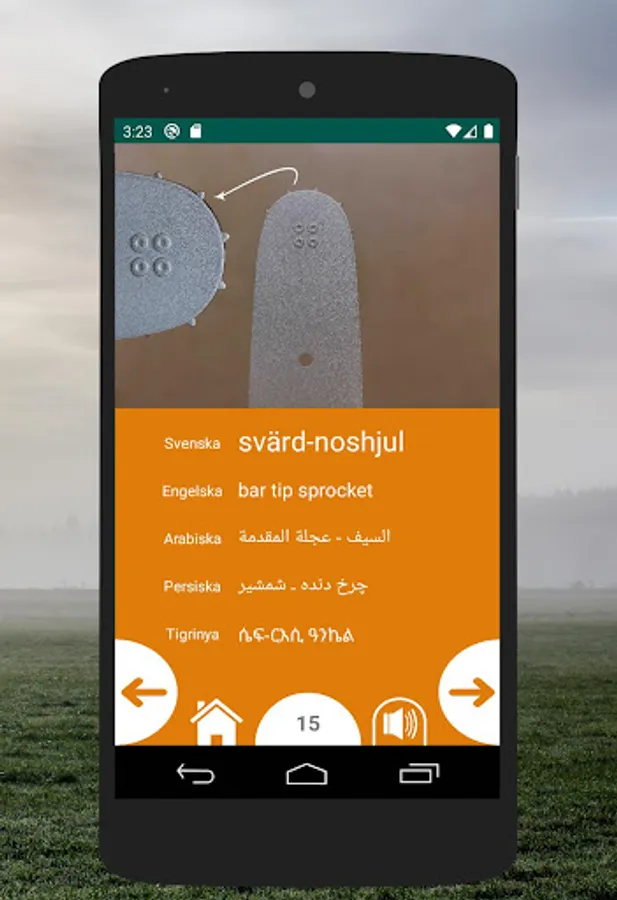This dictionary describes with words and pictures the parts used when working with a chainsaw. The words are written in Swedish, English, Arabic, Persian and Tigrinja and with sounds in Swedish.