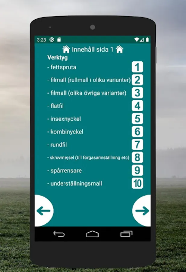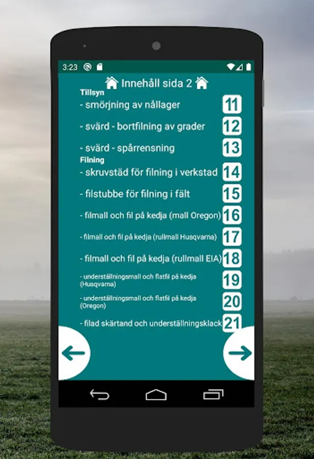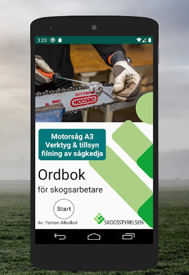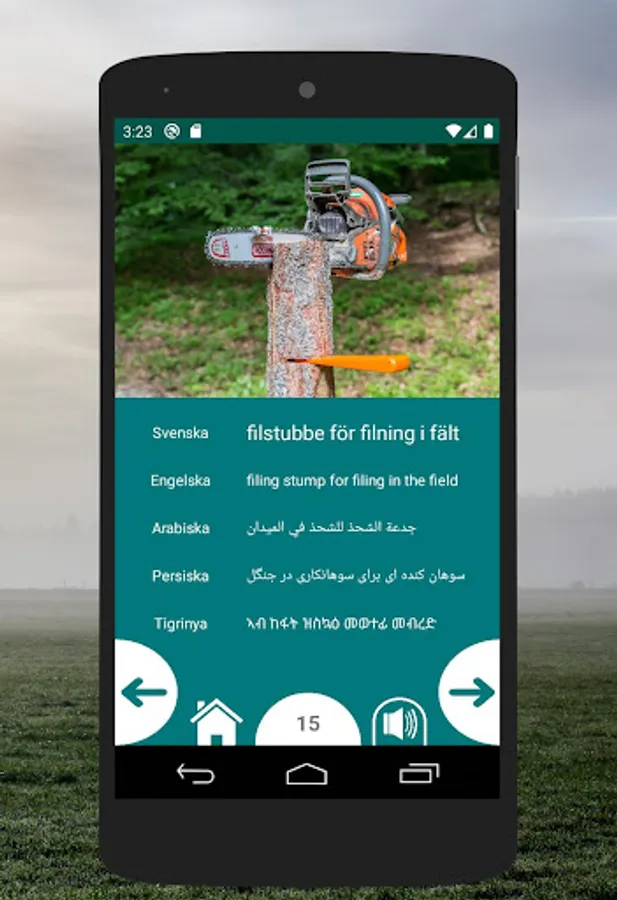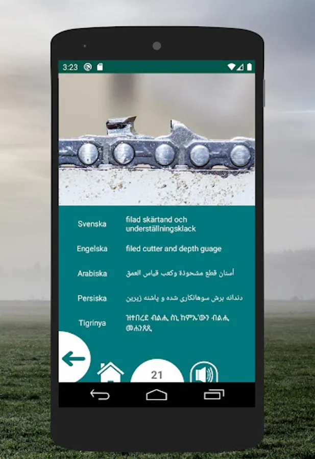 This dictionary describes with words and pictures the tools used when working with chainsaws. The words are written in Swedish, English, Arabic, Persian and Tigrinja and with sounds in Swedish.