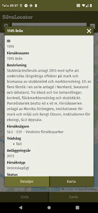 SilvaLocator is the mobile entry into Silvaboreal, which is a Swedish registry database of forest field trials. Its purpose is primarily to increase the availability of information related to forest field trials and demonstration areas around the country. The amount of information is large and has so far been both a difficult and underutilized resource.