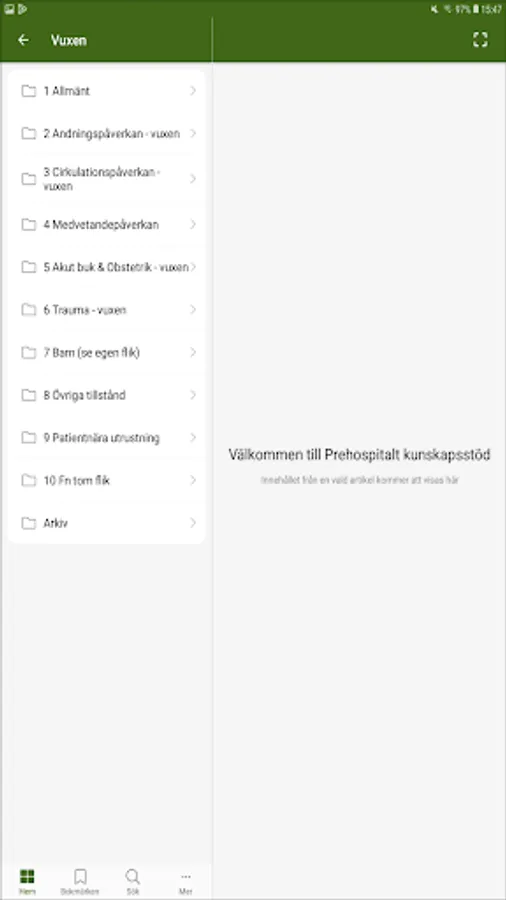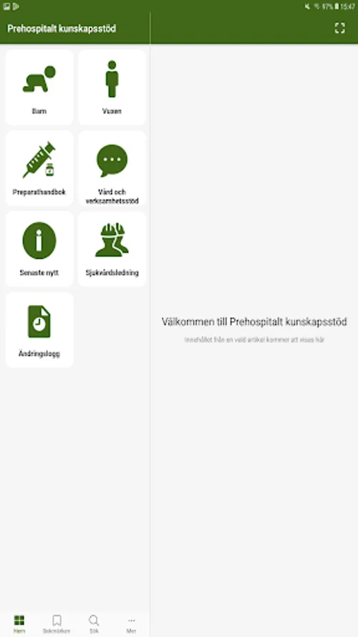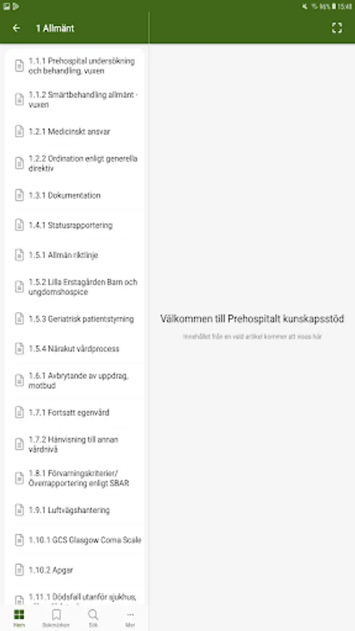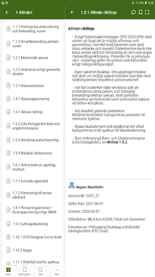 Pre-hospital knowledge and clinical training center in Region Stockholm makes available the medical treatment guidelines of the ambulance service, together with other clinical knowledge support, for professional health and medical staff in encounters with patients. The application provides the latest updated version of the medical treatment guidelines and provides accessibility even offline. Other knowledge support that is provided is - support in communication with the patient, - action cards in pre-hospital healthcare management, - list of changes, - other operational routines. Feel free to use the feedback function and contact us to continue the development of the content and the application. Thanks!