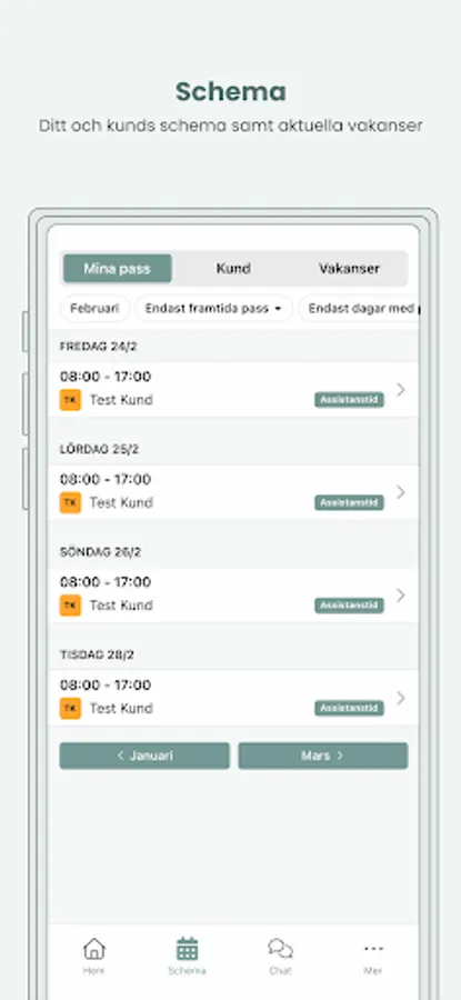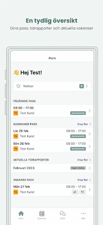 APO Assistance support is an app for our employees at AP Nursing Group. Via this app, you can access the schedule, timesheets, payslips, chat, work notes, etc. You log in with your BankID.