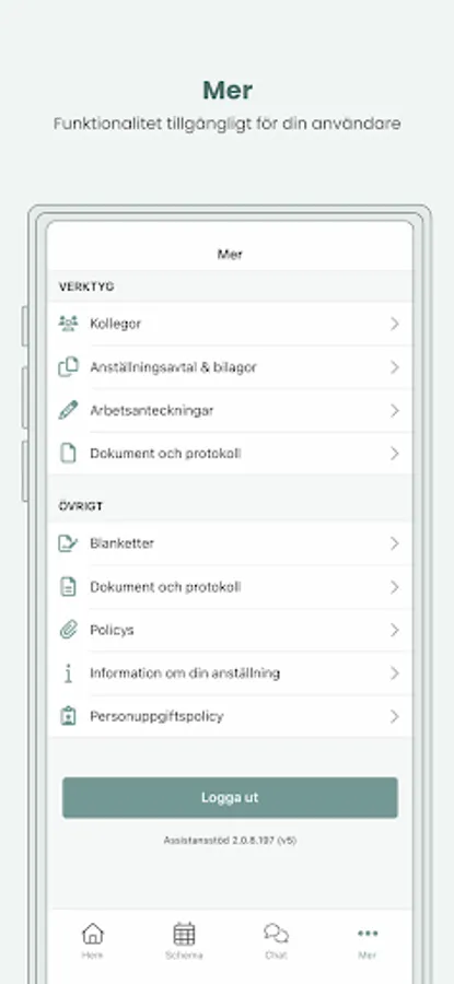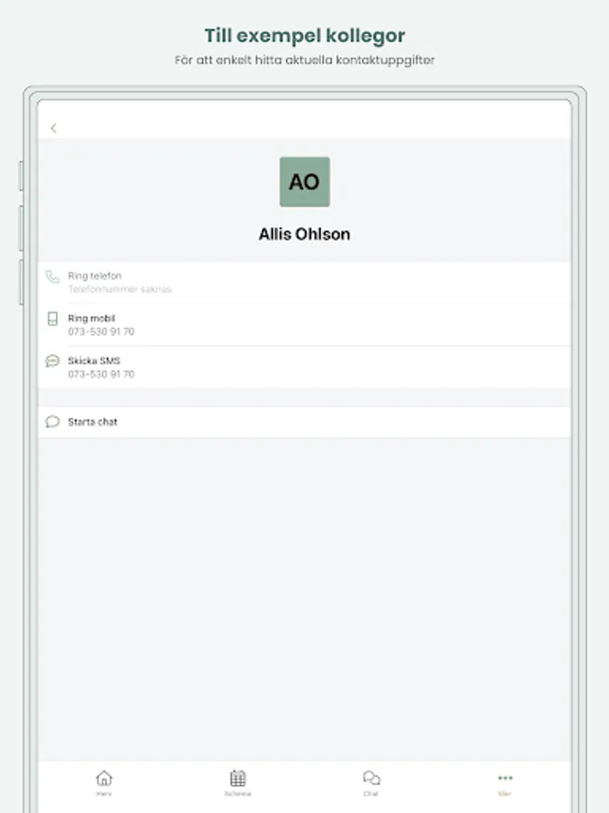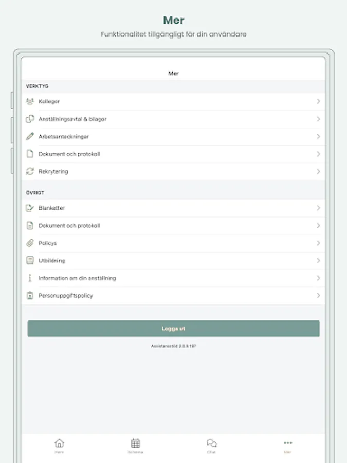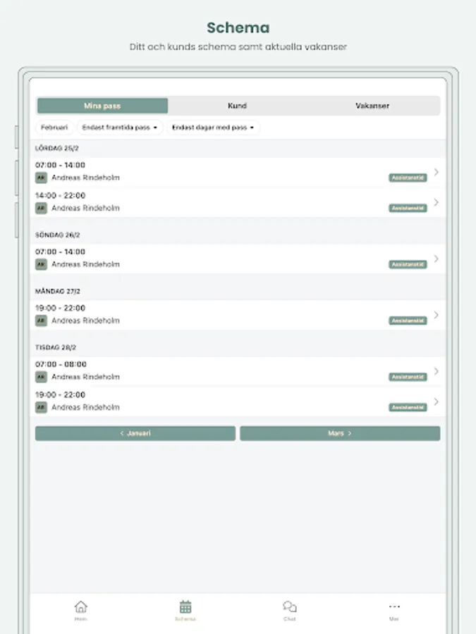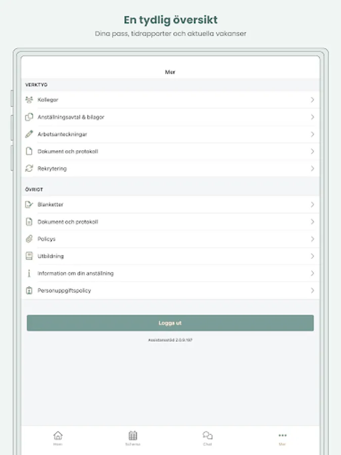 The assistance professionals is an app for our employees. Via this app, you can access the schedule, timesheets, payslips, chat, work notes, etc. You log in with your BankID.