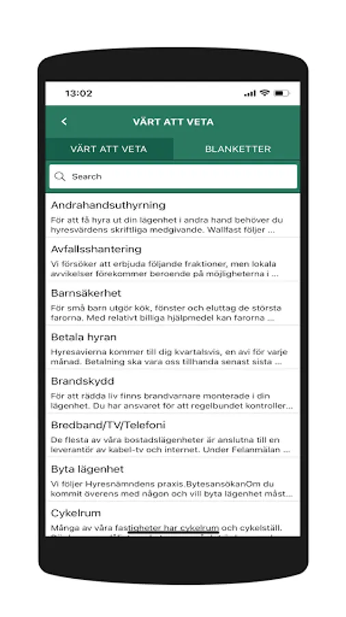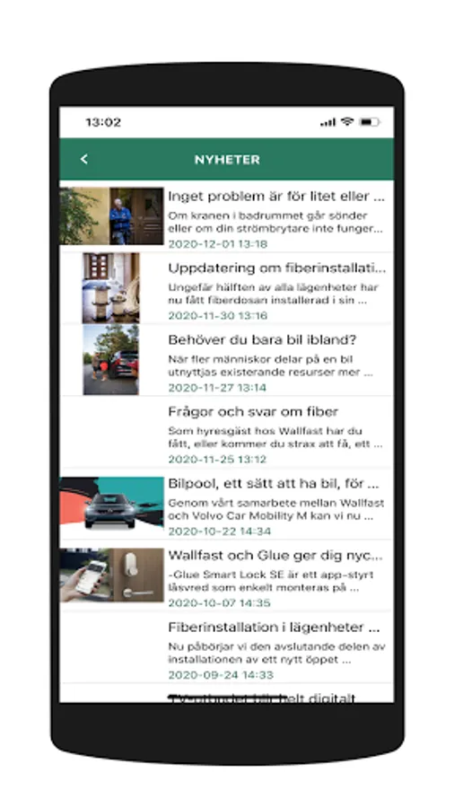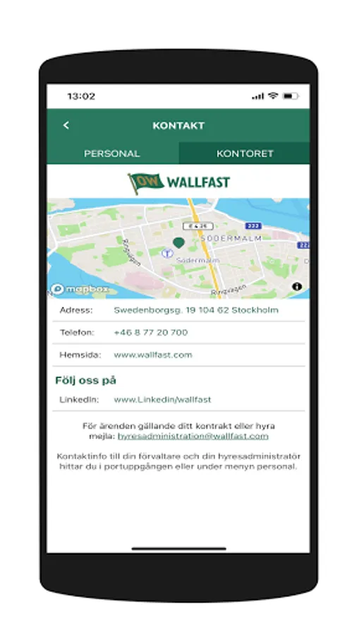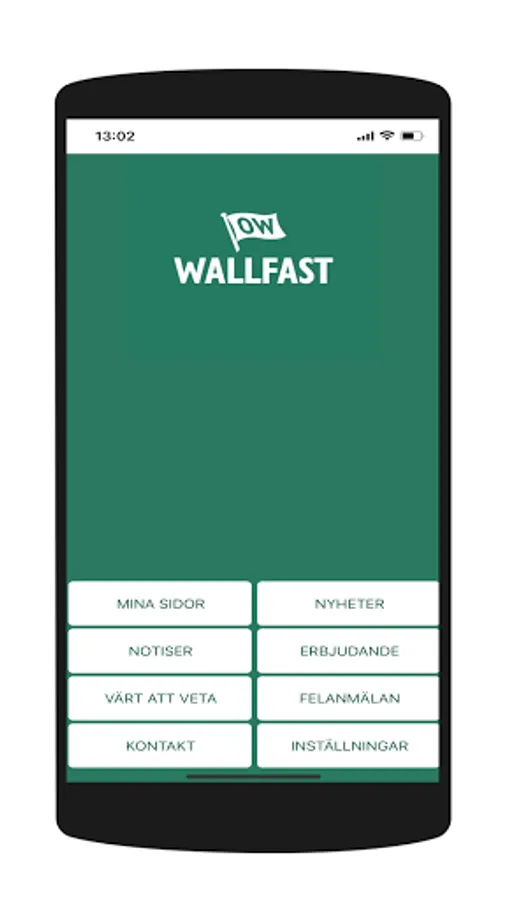 Wallfast's app for tenants. Here you will find information about your accommodation, can report errors and reach "My pages".