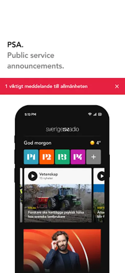 Get your updated news (hear news in different languages on the "Nyheter" section) and push notifications for Important public announcement (IPA), breaking news and live coverage.