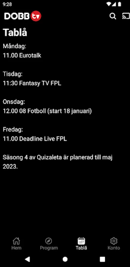On DobbTV, every week there are new episodes of our popular magazine programs that are streamed to those who have an account and subscription. Several of our programs are broadcast live and all programs can be watched afterwards or listened to via podcast in the app.