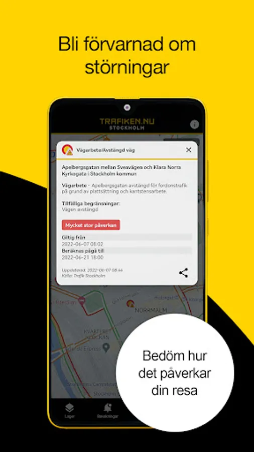 Trafiken.nu Stockholm is part of Trafik Stockholm. Trafik Stockholm is a collaboration between the Swedish Transport Administration, the City of Stockholm, Nacka Municipality and the Stockholm Region. The app is not a navigator but is intended to be used for the purpose of giving you relevant information about the current traffic situation before you start your journey.