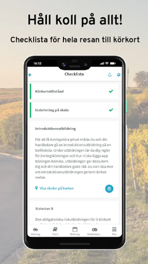 • Checklist with all the steps you need to take to reach your driving license. Keep track of how far you have come in your education.