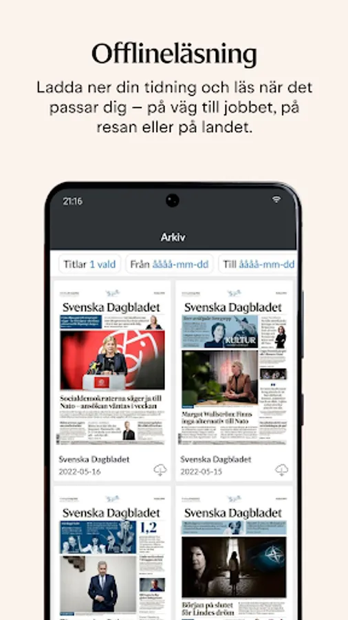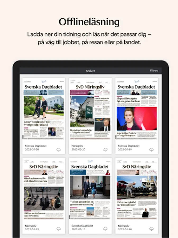 With eSvD you get access to tomorrow's newspaper at eight o'clock the night before. No matter how you read eSvD, it is easy to jump between different sections of the magazine, read articles as a regular newspaper page or as a readable text page. You can also choose whether you want to read eSvD offline or online, that is, if you want to download the entire newspaper at once or while you are reading. Perfect for those traveling.