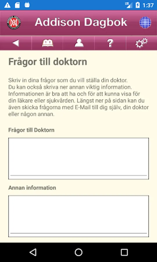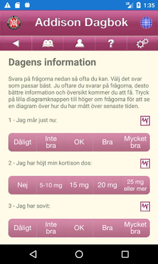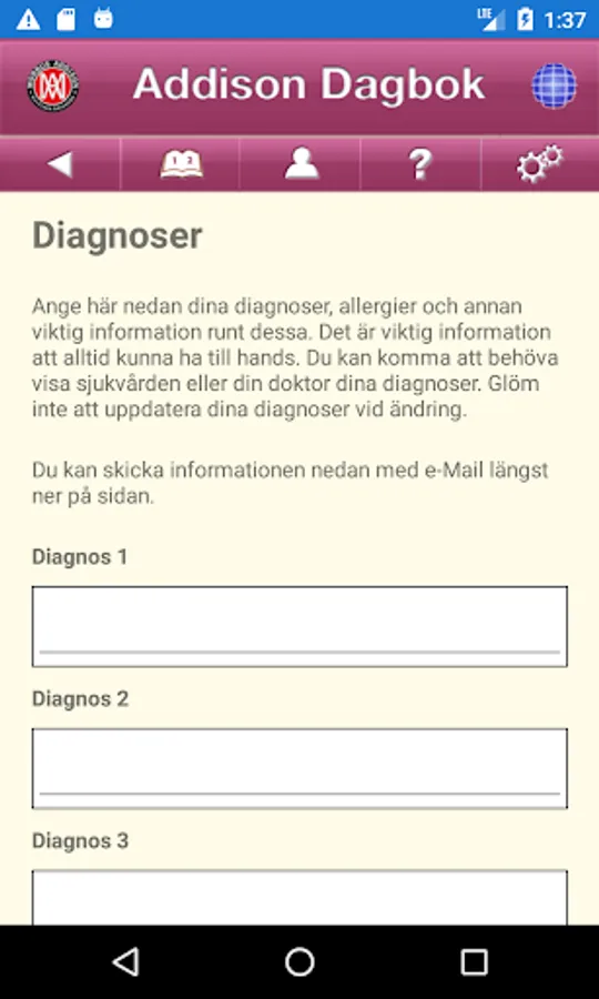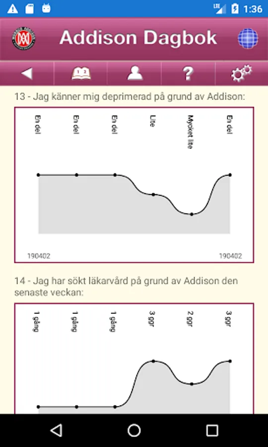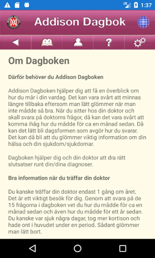 The Addison Diary helps you get an overview of how you feel in your everyday life. It can be hard to remember anymore because you easily forget when you didn't feel so good. The diary helps you and your doctor to draw the right conclusions about your / your diagnoses. The app is both in Swedish and English.