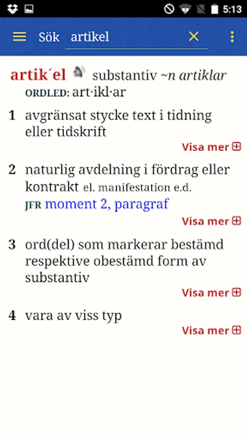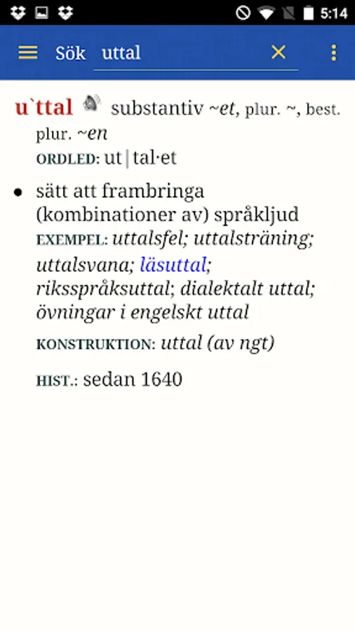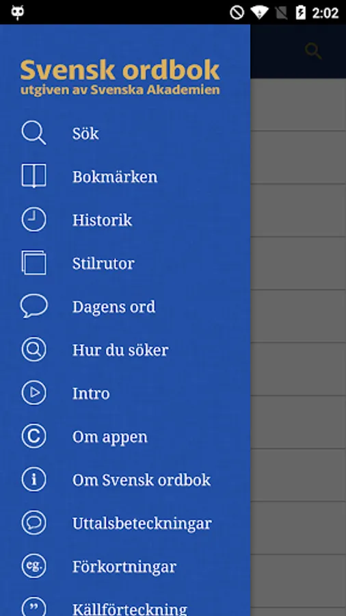 Ordboksappen reflects the content of the Swedish Dictionary published by the Swedish Academy, which came out in print in 2009. The dictionary provides a detailed description of the general vocabulary of modern Swedish. The emphasis is on the meaning of words and use in combination with historical data.