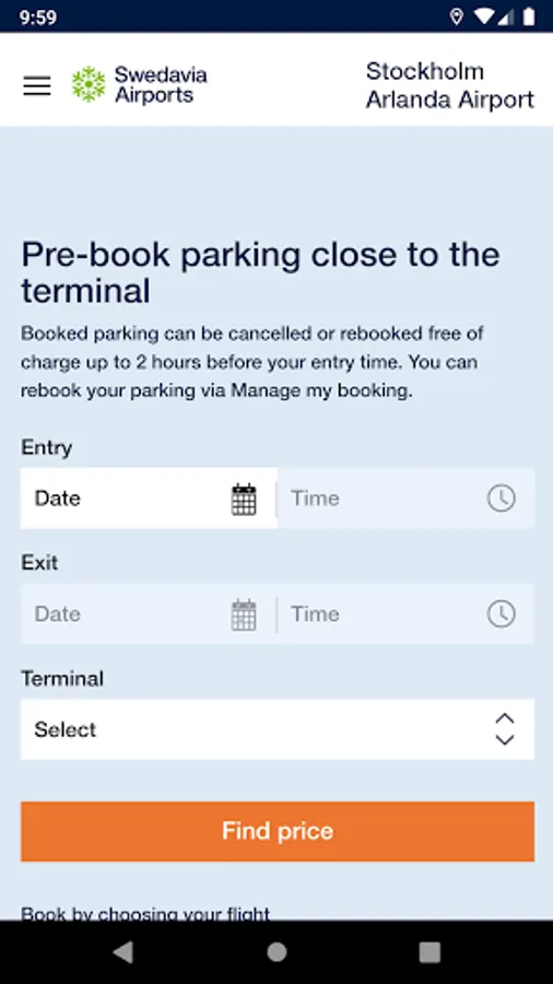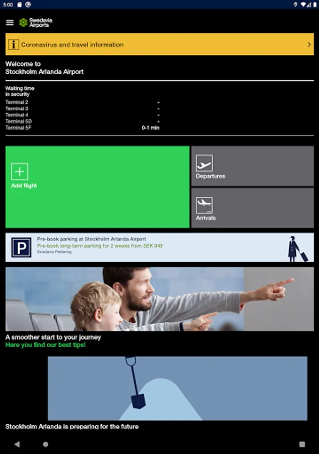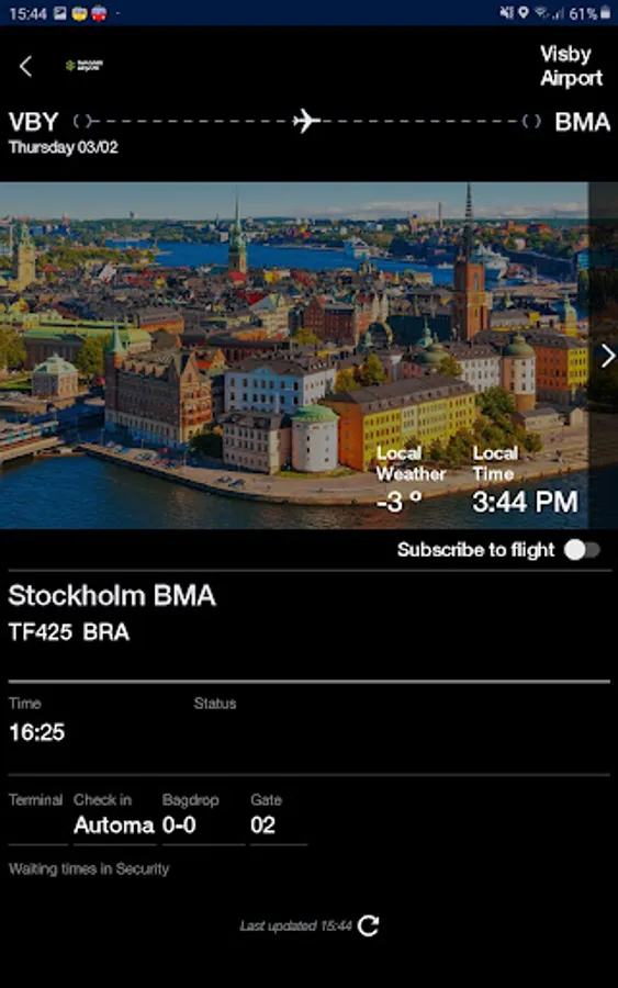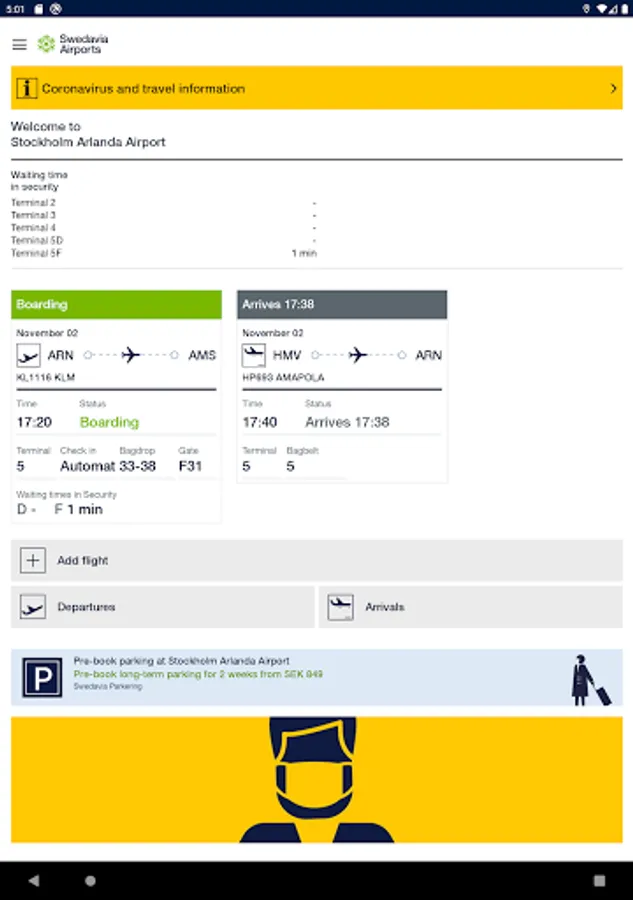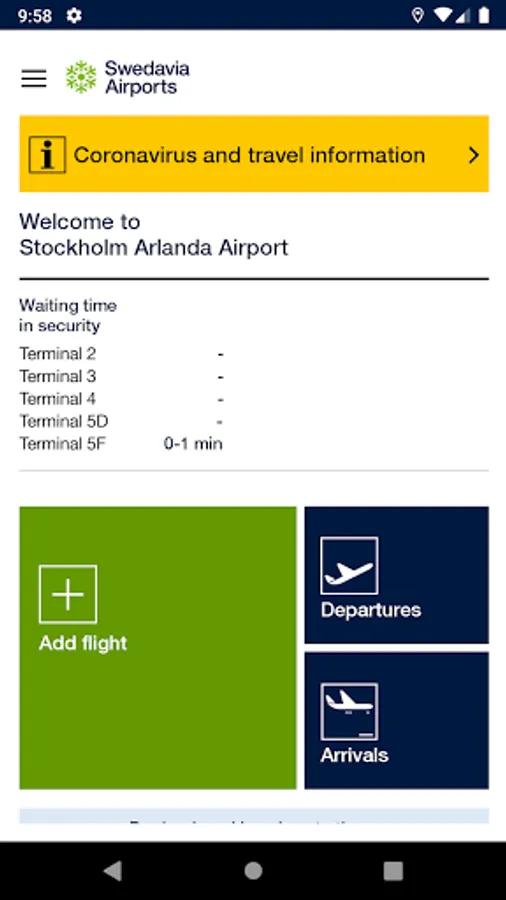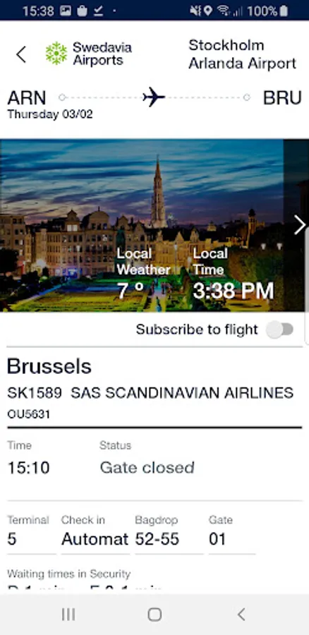 Waiting time at the security checkpoints at Stockholm Arlanda Airport, Göteborg Landvetter Airport and Bromma Stockholm Airport. When you’ve added your flight to the start page, the waiting time at the security for your particular flight is shown. You also get information about the terminal, check-in counter and gate.