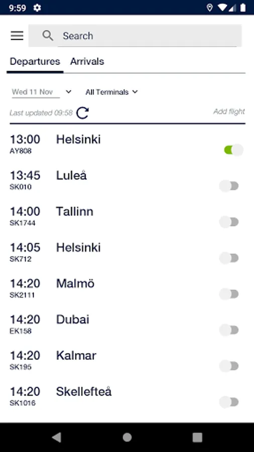 Here’s where you get all the information about your flight: waiting time at the security checkpoint, arrival/departure, gate and check-in counter. Add your flight to the homepage and check in right in the app. If you are landing at one of Swedavia’s airports, you see when your baggage is expected to arrive.