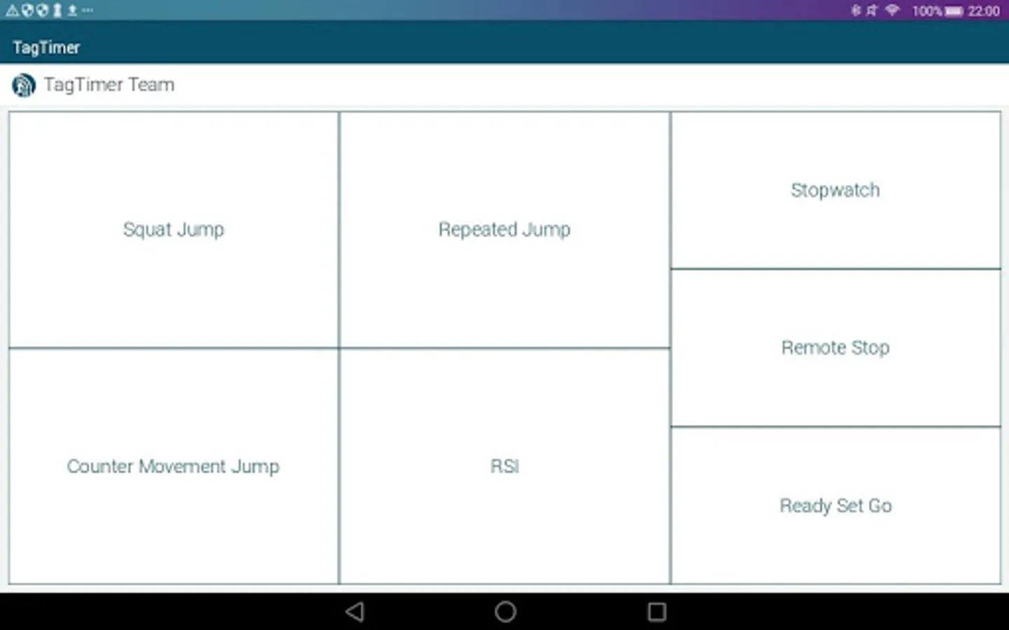 TagTimer app can be used for timing and plyometric tests. The app must be used with TagTimer bluetooth measurement device.