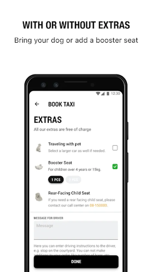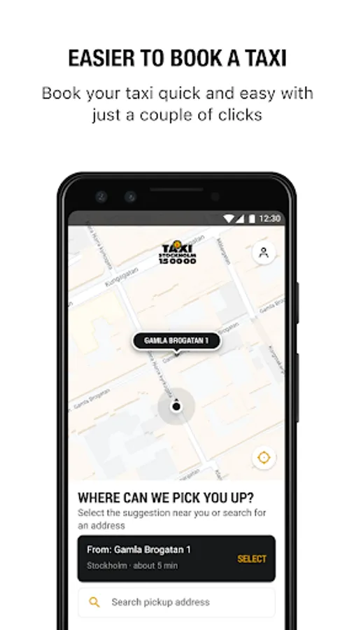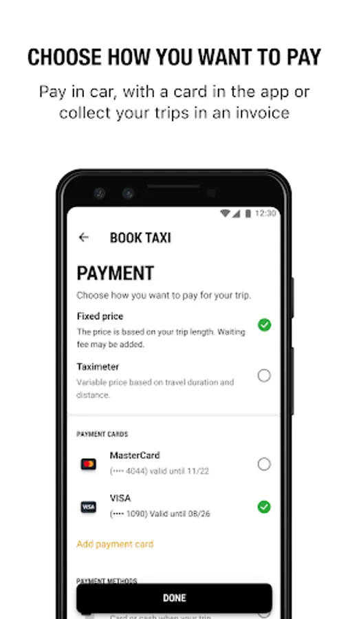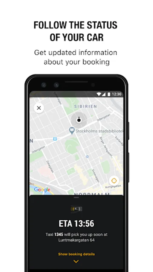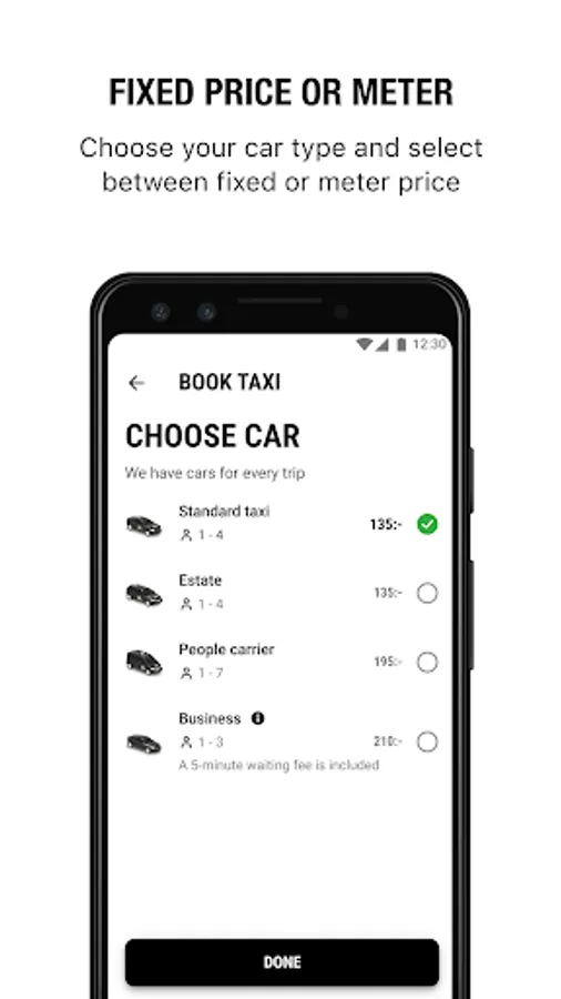 In the app you can book your trip quickly and easily. Choose between standard, business, or large taxis, with or without extras as a child seat or room for your dog. You can also choose to travel for a fixed or metered price, and pay with your card in the app, via invoice through your taxi account, or directly to the driver in the car.