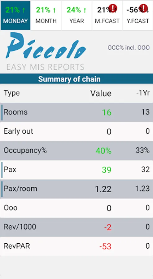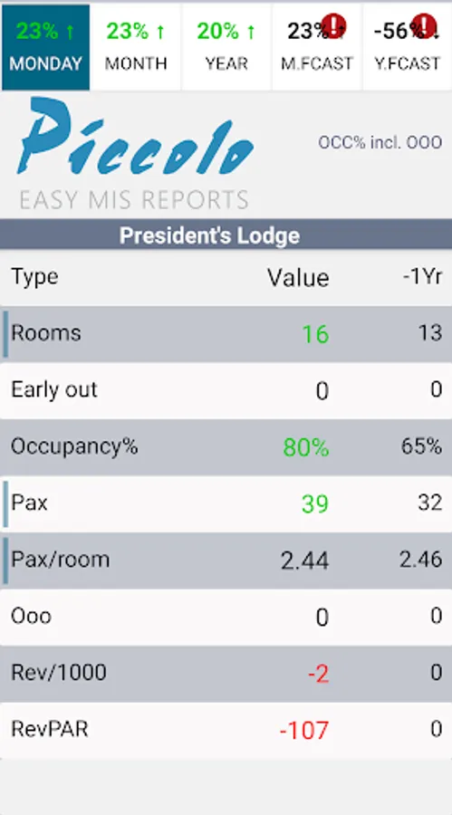 Use Piccolo to get an instant colour coded overview over how your hotel or your chain is doing today compared to how it was doing last year at the same time.