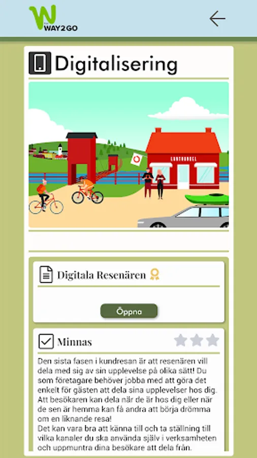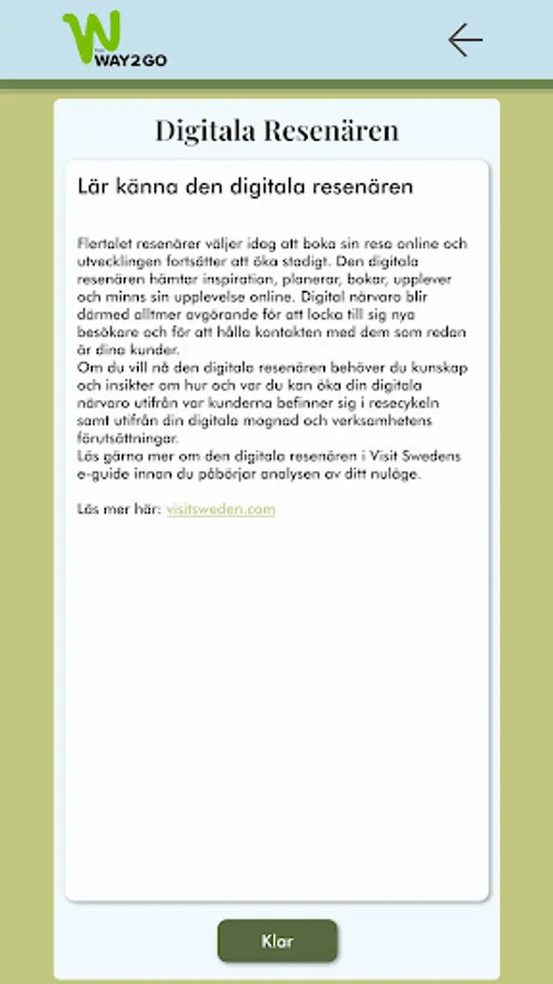 The digital revolution has only just begun. Our guests' lives, consumption and information seeking are moving out into the digital landscape. The challenge in the coming years will be to accompany them there, and be present in all the channels and forums where our potential guests stay. The overall focus area digitization means creating new business models, communicating and selling experiences in Dalarna and how we use new technology to enhance and deepen our experiences and offers before, during and after a visit to Dalarna. The current situation analysis in the app is a tool that gives you prioritized action proposals to strengthen your company's digital presence.