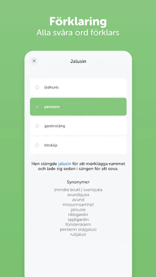 The app contains over two thousand difficult Swedish words. All words have an explanation, synonyms and you can get the word in one sentence. Everything for you to learn the word and build your own vocabulary.