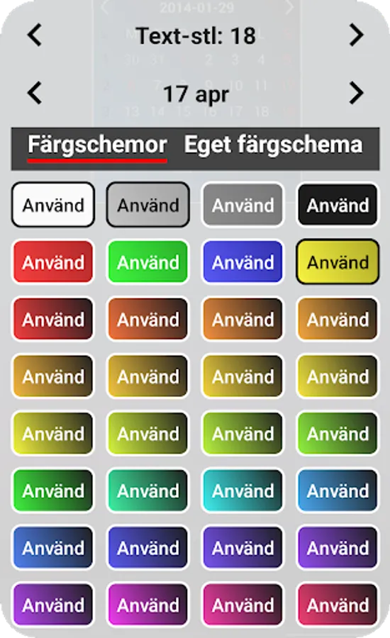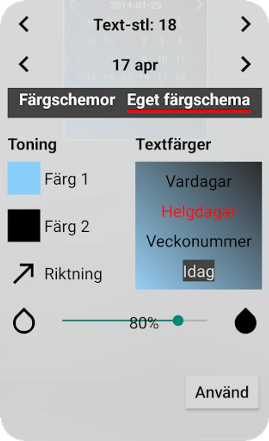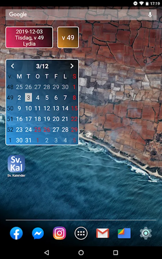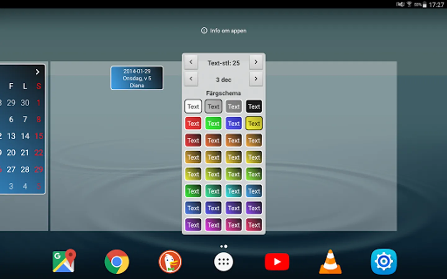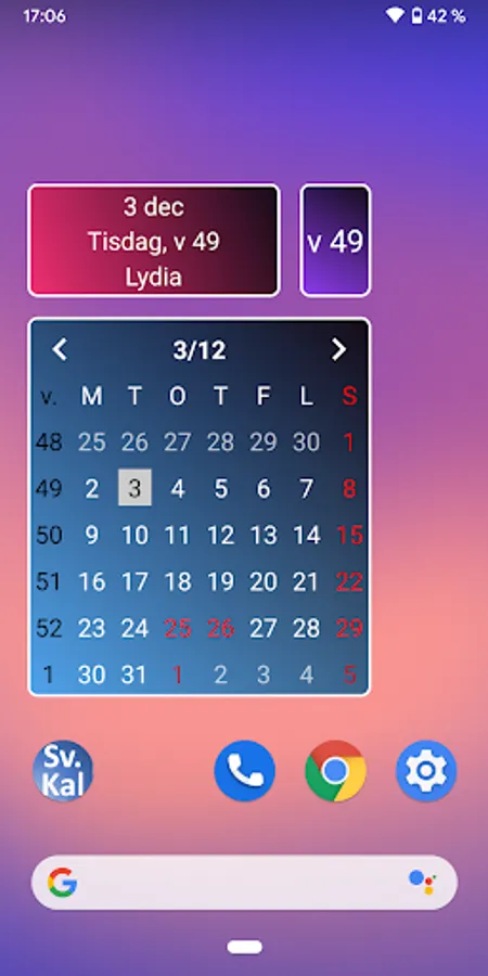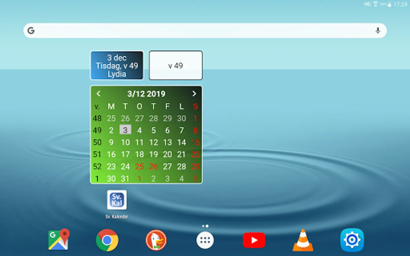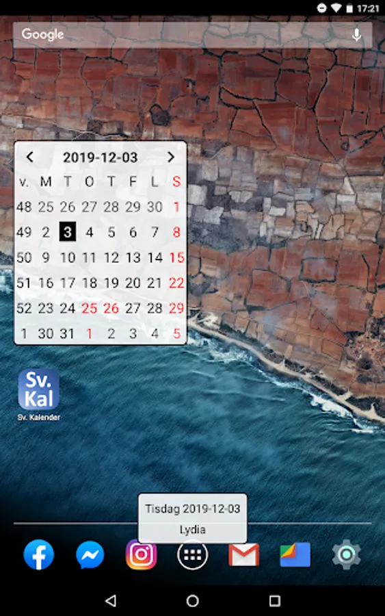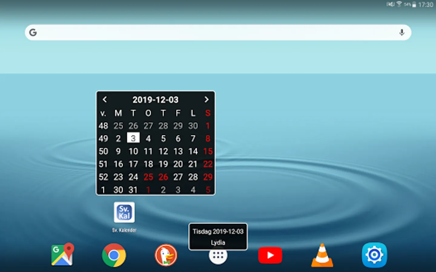 A Swedish calendar in the form of three so-called widgets: Monthly calendar, Daily calendar and Weekly number. The calendars show Swedish holidays, Swedish name days and week numbers according to the Swedish standard. Background color, text size and date format are selected by the user.