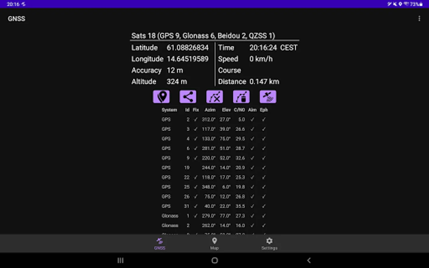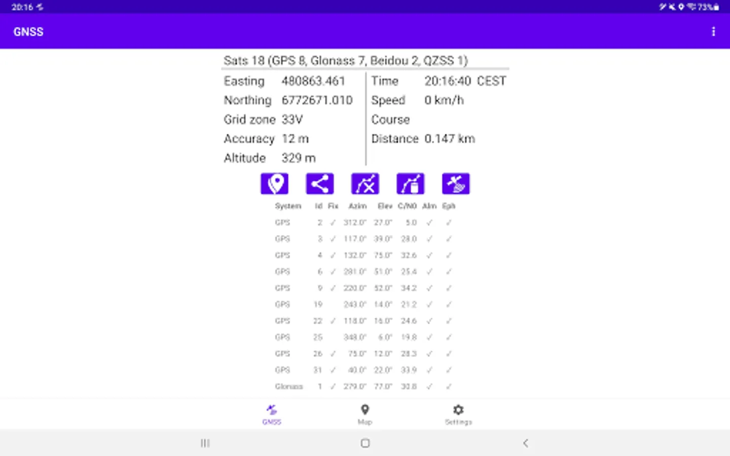 GNSS Viewer (Global Navigation Satellite System, ie, GPS, Glonass, Beidou, Galileo, IRNSS) displays current GNSS information as reported by the built-in GNSS unit of your phone (or tablet). The following GNSS data are displayed: