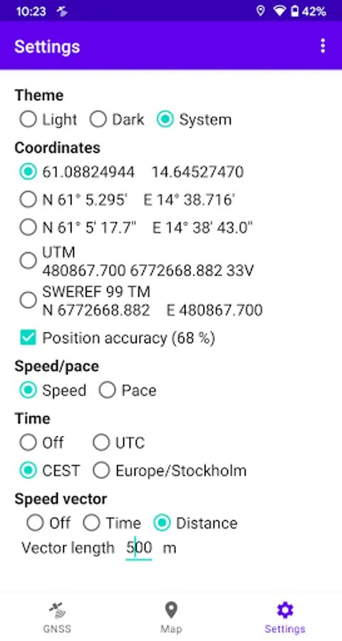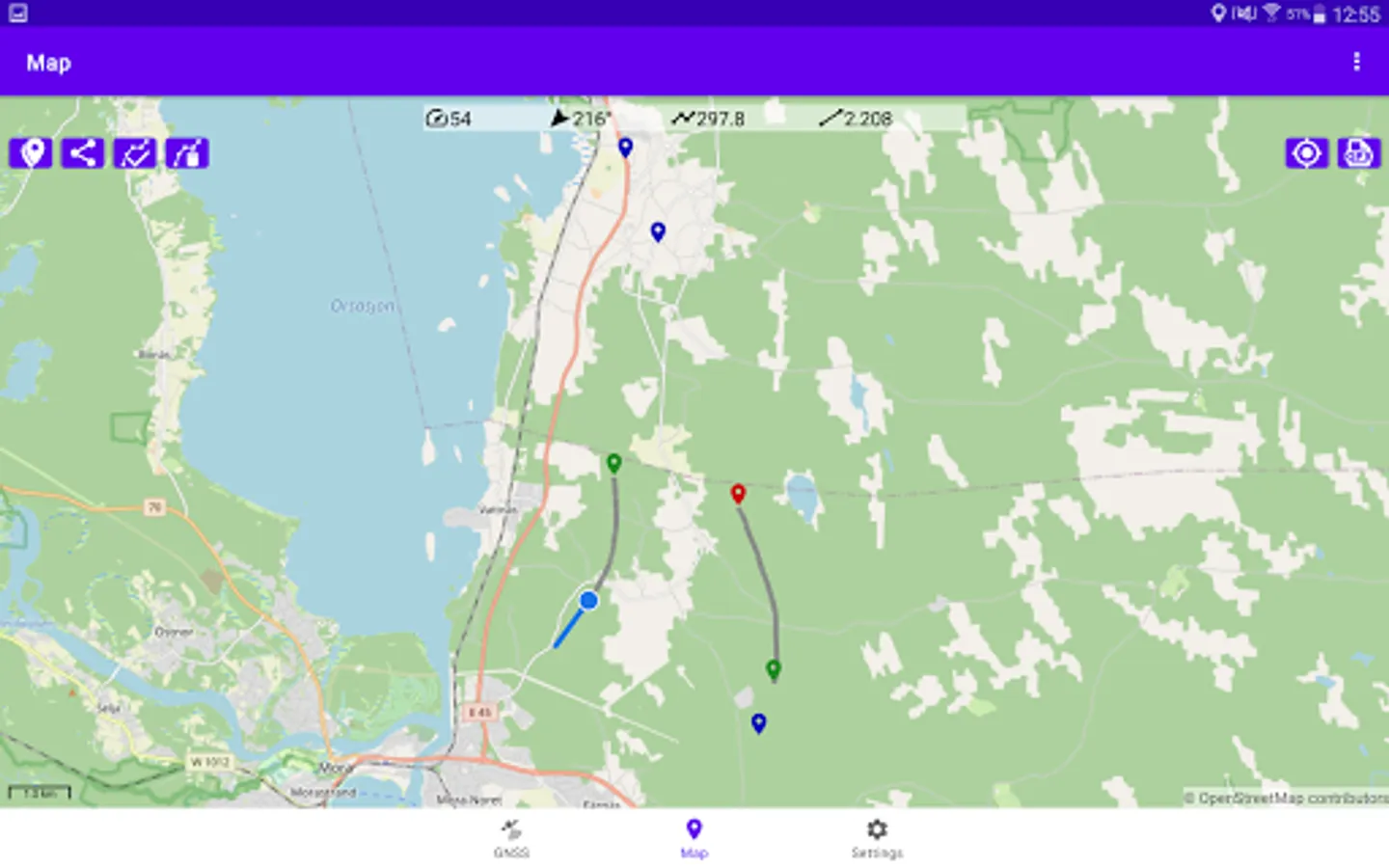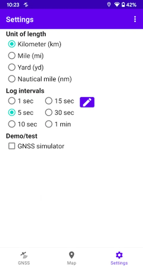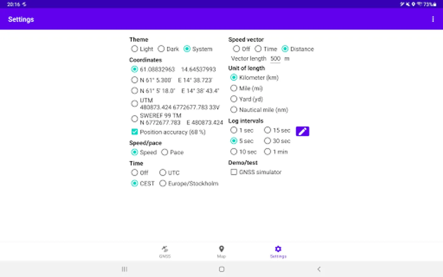 GNSS Viewer can log your position at user-defined intervals. The resulting track is displayed on a map and can be exported as a GPX/CSV file, for example via e-mail.