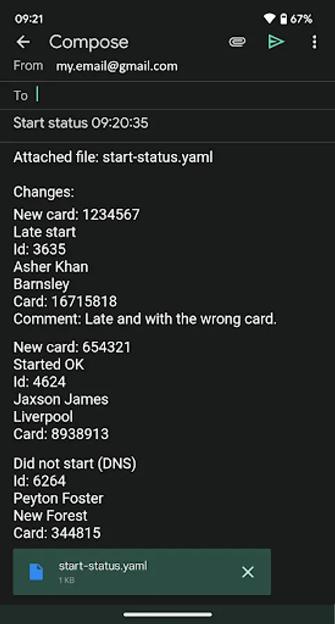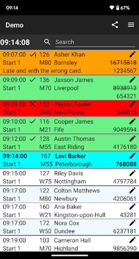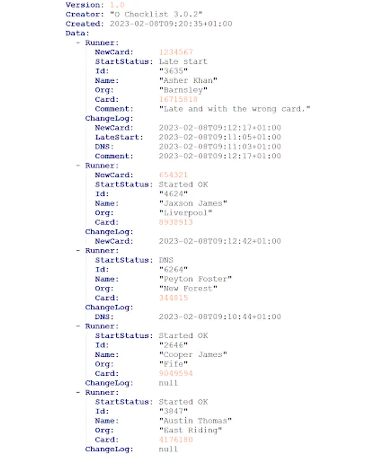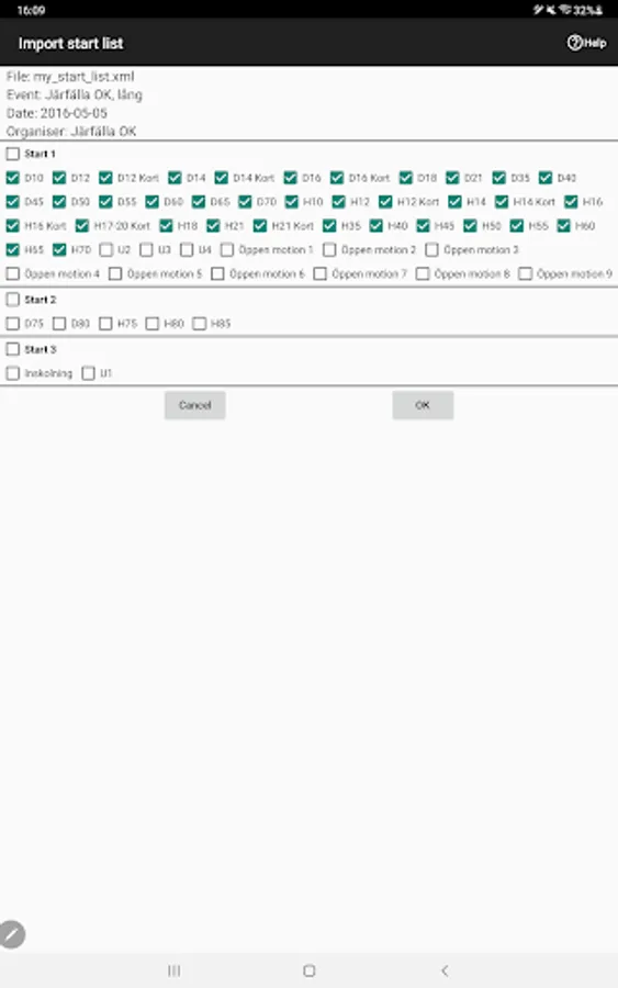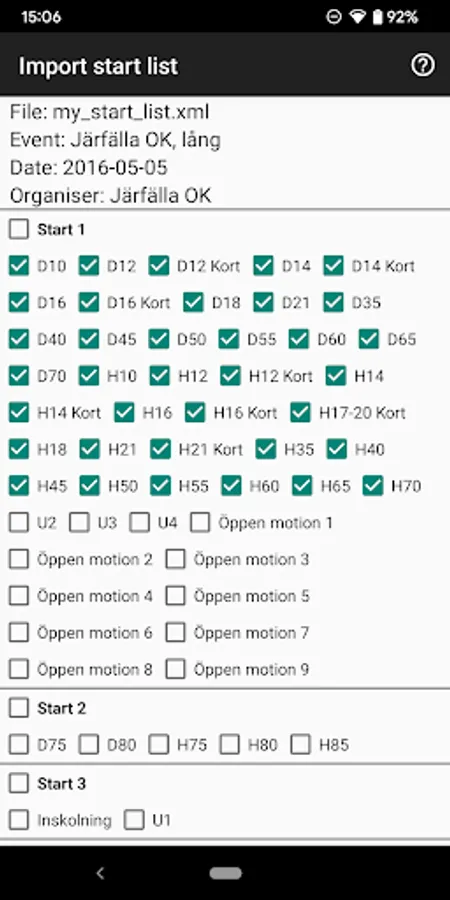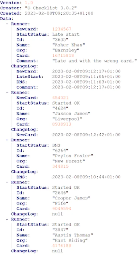 The checklist (the start list) is imported through an XML file in accordance with IOF Data Standard 3.0, or, through a CSV file.