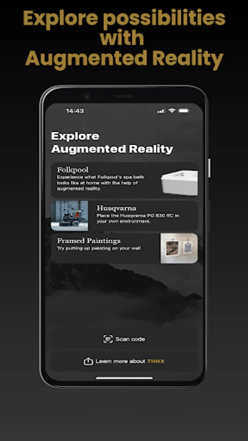 But that's not all! THNX goes beyond just placing objects in your environment. With the app's advanced scanning capabilities, you can effortlessly scan QR codes to unlock on-site experiences. Whether you're at an event, a museum, or a retail store, THNX AR Experience enhances your surroundings and offers unique and tailored content. Simply scan the QR code, and watch as the physical world around you transforms into an interactive and engaging digital realm.