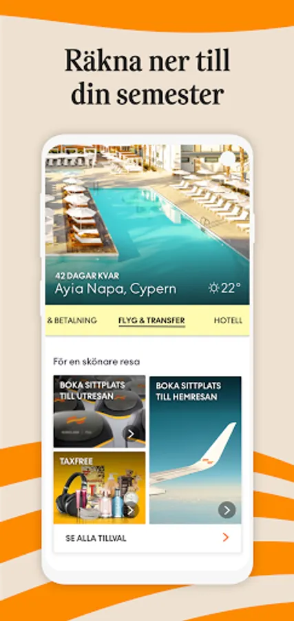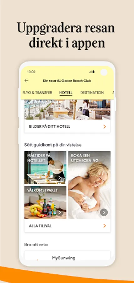 Once the trip is booked, perhaps the most fun begins! In the app, we count down to your holiday with you and make sure you have everything you need before the trip. You log in with the same e-mail address and password as on Ving.se, and can also share the trip with your travel companion so you can enjoy the upcoming holiday together. In the app, you also have the opportunity to upgrade your trip - perhaps with a little more luxurious flight food, really good seats on the flight or a welcome package waiting for the hotel room when you arrive.