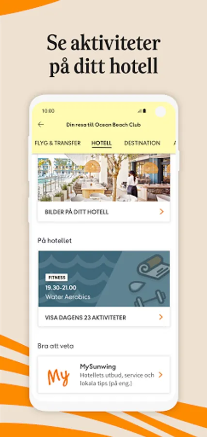 Our app is also the ultimate companion during your journey. If you travel with our own airline SunClass Airlines, you check in on the flight directly in the app, where you will also find all your boarding passes. We give you full control of flight times and transfers, and we have also saved the map, address and contact information for the hotel and Ving at the destination for you so that you always have them available.