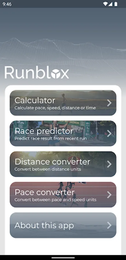 Runblox is a toolkit for runners and athletes, containing simple, yet useful tools. The calculator will take two variables of distance, pace and time and calulate the third, the race predictor will predict future race finish times based on a recent run, and the converters will forever get rid of the problem of converting from the metric to the imperial system for distance and speed.