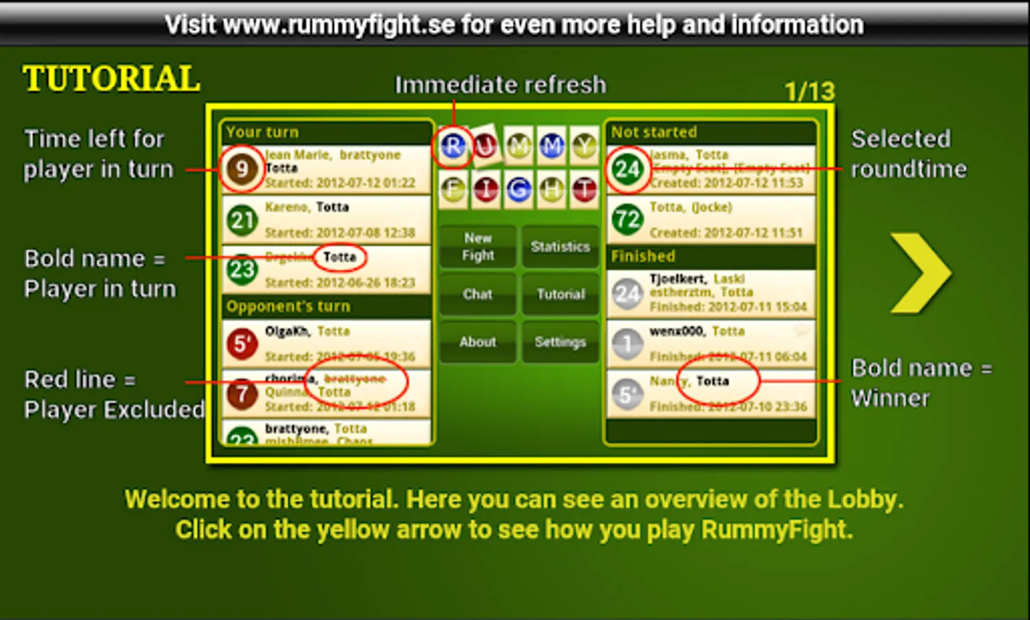 RummyFight includes a Tutorial, Lobby Chat, In-Game-Chat, Settings, Statistics, Rating System, Friends List, a hidden puzzle game and lots more.