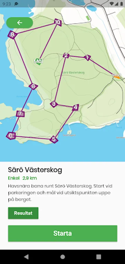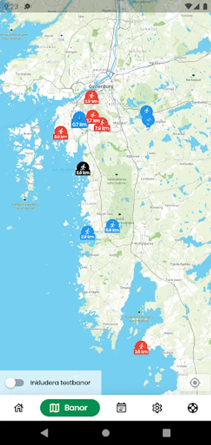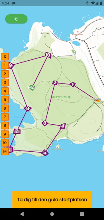 När du är redo att springa en bana klickar du på "Spring"-knappen. Om du inte redan står i startområdet kommer appen att visa vart du ska. Starten är gul och målet är grönt. Varje checkpoint måste besökas i rätt ordning för att räknas.