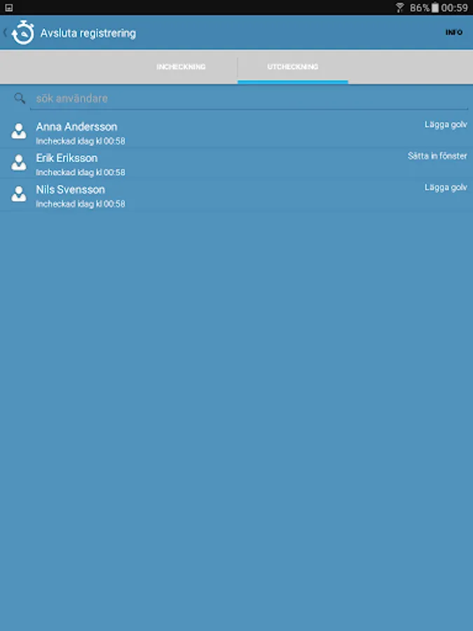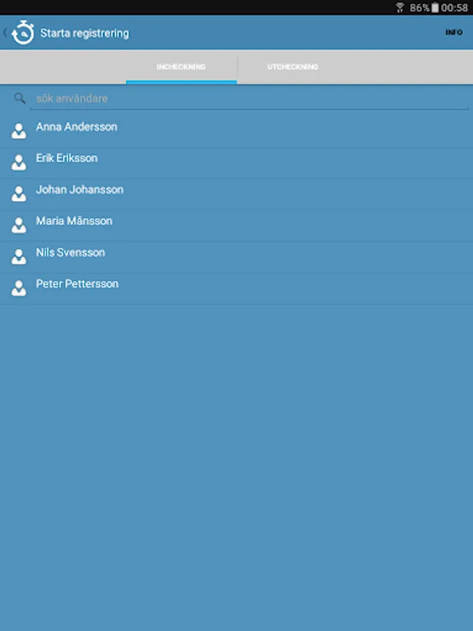 TimeOrganizer Stamp makes it possible for multiple users to be checked on the same device at the same time. Install the app on a tablet which is placed in eg entrance or reception. Users will be able to easily check in / out during the day with a personal PIN code.