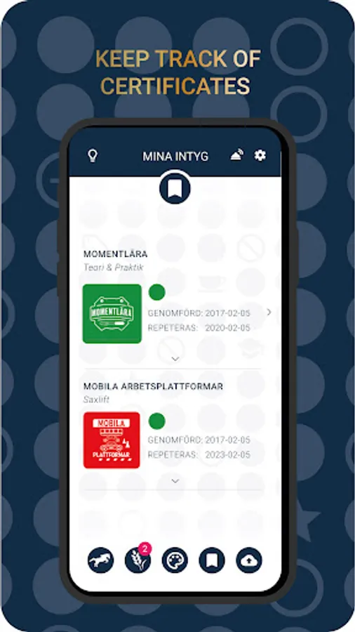Here are all your stored certificates. The symbols and signal colors reveal, for example, whether the certificate is valid or needs to be repeated in the near future. Do you have certificates that are not on the list? Go to UPLOAD and submit to us for registration.