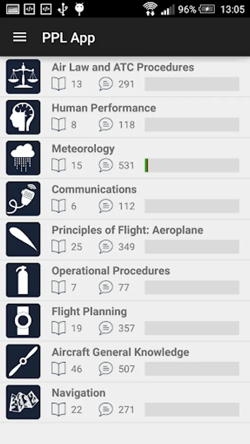 The PPL-App contains questions for each and every part of these published goals, ensuring wide and deep coverage of the necessary knowledge across all EU states. The question database is published in the English language, but can be used by PPL and LAPL students from any EU state to prepare for their national exams.