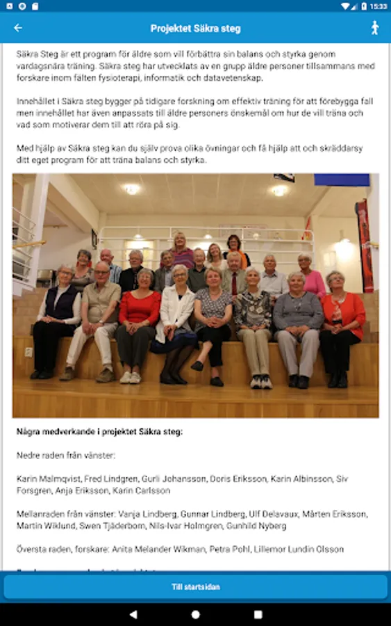 The effect of training with Safe Steps is now being evaluated in a national controlled study aimed at older people over the age of 70. The study is approved by the Research Ethics Committee in Umeå (Dnr 2018 / 433-31). For detailed information about the study and the notification, see http://www.sakrasteg.se
